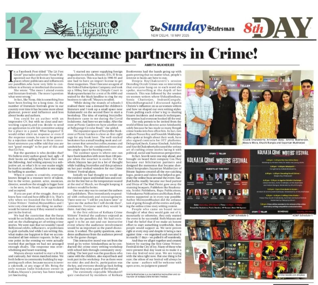 The Statesman was the first English newspaper I read, or rather I was advised to read for a better command over English. To see my name and picture in the same paper for being a part of the Kolkata Crime Writers Festival at Storyteller Bookstore feels surreal. It’s equally wonderful to see both my books, ‘The Sanyasi who became a King’ and ‘Diary, Deceit and Death’ featured prominently in the article.