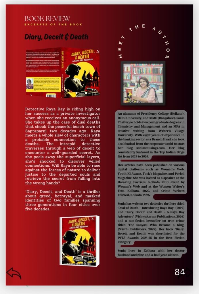 My detective thriller in the Detective Raya Ray series titled ‘Diary, Deceit and Death’ published by Vishwakarma Publications (link to buy – https://www.amazon.in/dp/9395481862 )